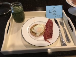 On the morning of day two, I whipped up some eggs, toast with avocado spread, bacon and her favorite Green Juice. I snuck into the bedroom and I set it next to the bed with a note telling her I love her. The smell of bacon is a great way to wake up!