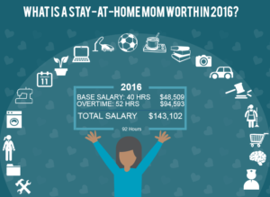 According to Salary.com in 2016, on average a Stay-At-Home Mom works 92 hours per week and assumes 31 different roles including cook, nurse, psychologist, housekeeper, day care teacher, laundry operator and driver. If you had to put a value on all of those hours worked and roles taken on, this would be a $143,102 annual salary.
