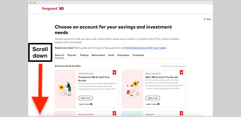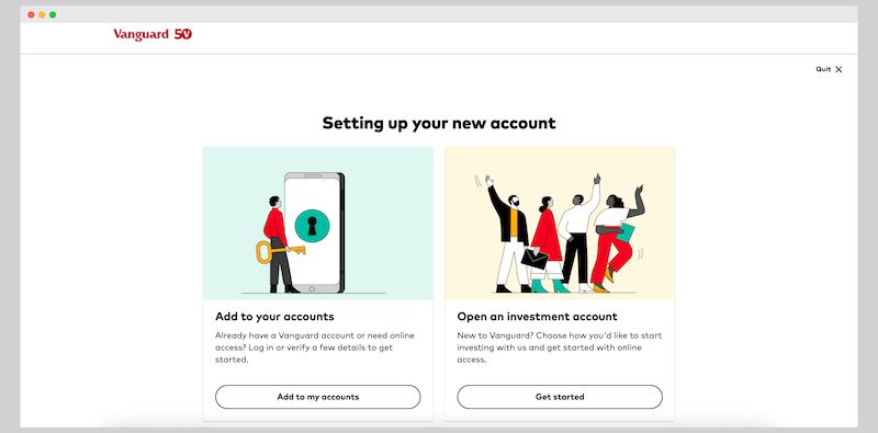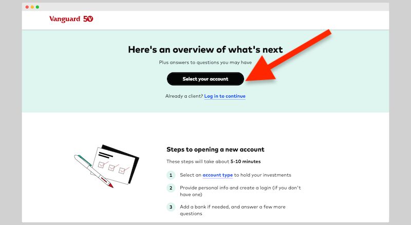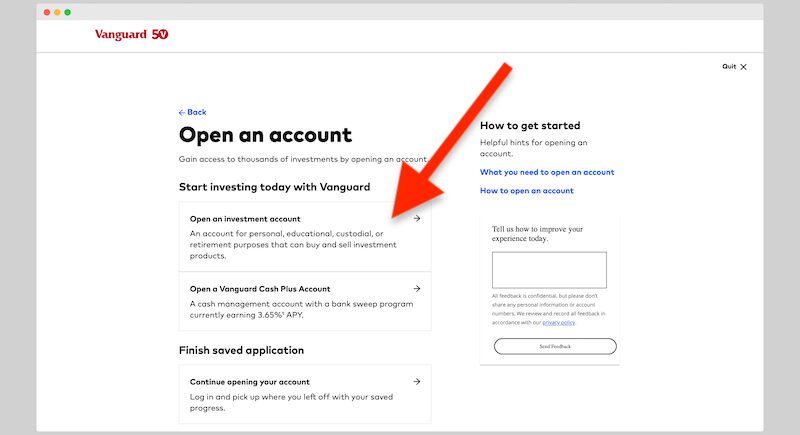 Choose how you’d like to get started. If you’re opening a new account with Vanguard and you’re not transferring over or rolling over investments, choose “open a new account.”