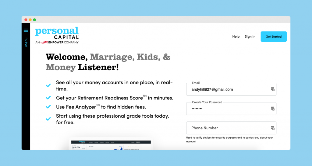 - Create a Personal Capital account. Sign in with your email and phone number, then confirm your identity. They take security seriously–more on that later!