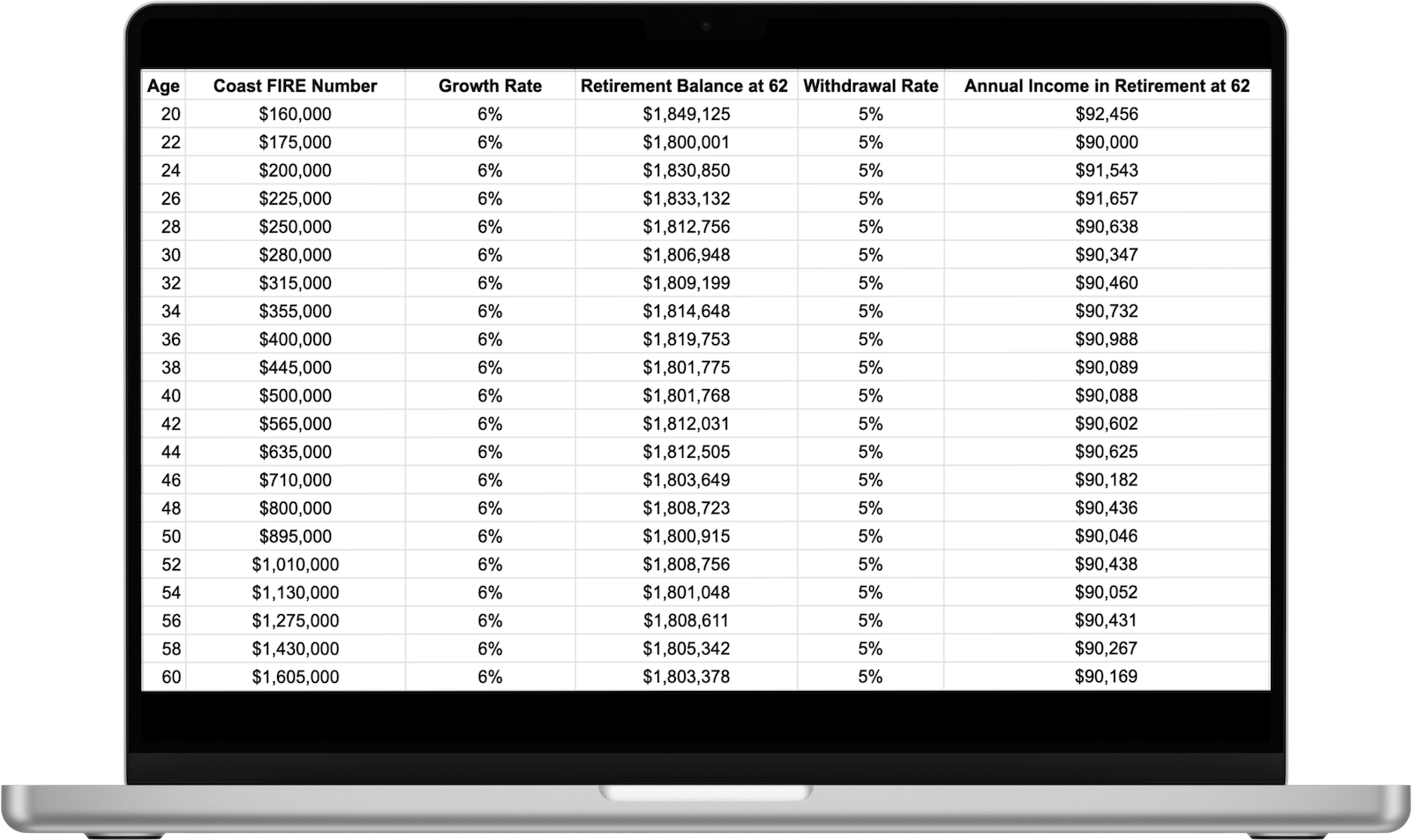 For fun, let’s add the ages between 20 and 60 so people can see how they are tracking on their Coast FIRE journey. After all, you might be right in the middle of one of these decade milestones and be eager to jump on this Coast FIRE goal!